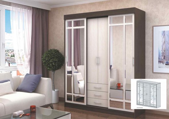 А это пример шкафа с тремя дверями-купе. Вообще, эта схема рассчитана на двери типа купе. Если вы поставите распашные, то тут их может быть и четыре единицы.