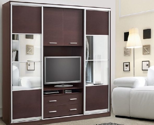 Схемы средней зоны купе для прихожей дополняются зеркалом, крючками для верхней одежды, зонтов, сумок. В детской комнате монтаж штанг следует выполнять на комфортной высоте для ребенка. В шкафу купе для спальни, гардеробной монтируют фурнитуру для повседневной одежды – костюмов, брюк, рубашек, блузок, юбок, в гостиной можно установить купе с телевизором в средней зоне.