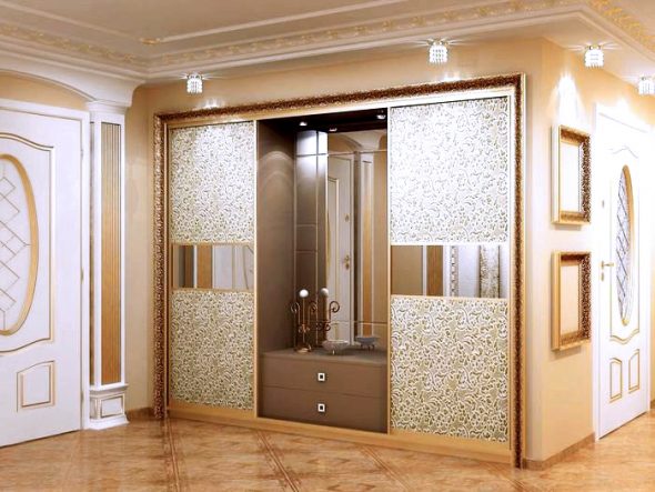 Хорошо выбирать модели, на фасаде которых есть зеркало во всю величину дверей. Это поможет решить проблем с зеркалом, поскольку в прихожей оно обязательно должно быть. В зависимости от интерьера комнаты и от типа освещенности, можно выбрать модель шкафа, на фасаде которого установлены точеные светильники.