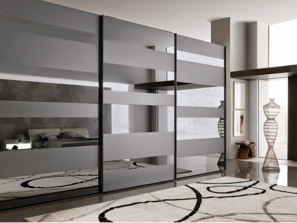 Если комната характеризуется маленьким размером, следует рассмотреть вариант зеркальных раздвижных дверей – они хорошо справляются с визуальным увеличением помещения. Шкаф купе в спальне на фото внутри комнаты выглядит небольшим, но благодаря зеркалам, комната выглядит в два раза большей.