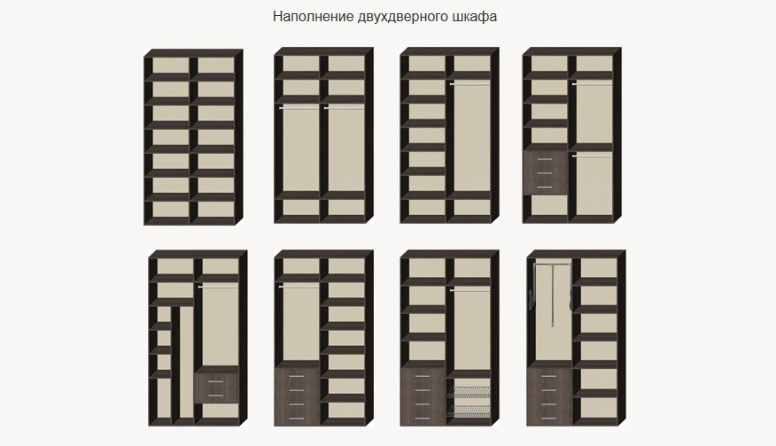 Стандартного, подходящего для всех, варианта наполнения в шкаф купе не существует. Некоторые производители на своих сайтах предлагают заказчикам рассмотреть фото типовых моделей и сделать просчет стоимости с учетом индивидуальных параметров, количества полок, ящиков, вида фурнитуры, используемых материалов, услуги сборки. «Свое» наполнение можно увидеть до изготовления, внести необходимые корректировки исходя из размера семейного бюджета: