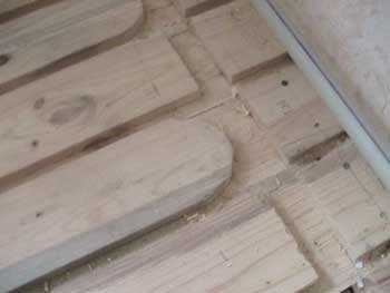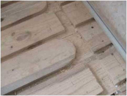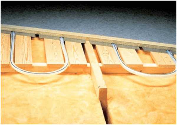 Готовые пазы для монтажа водяной трубы водяного теплого пола под деревянные полы изображены на фотографии.