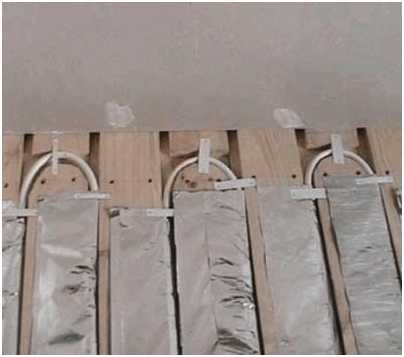 Благодаря пазам, укладка отопительного контура делается легко и быстро. Перед тем, как работать с трубой, над пазами разматывается фольга. Уже после этого в пазы укладывается труба, диаметр которой не должен превышать 16 мм. Для того, что бы получить максимальную теплоотдачу, трубу заворачивают в фольгу, прикрепив ее края скобами к деревянным доскам.