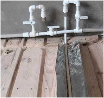 Прежде чем приступить к проектированию системы отопления «водяной теплый пол», необходимо обследовать деревянные конструкции, перекрытия, лаги и другие несущие элементы. Деревянное основание, состоящее из досок, должно быть цельным. Существующие между досками щели тщательно заделываются теплоизоляционными материалами. Пол в деревянном доме обычно монтируется на лагах, поэтому важно изучить и их состояние и расположение.
