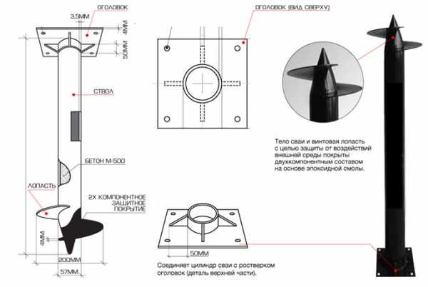 Полые стальные трубы при вкручивании в грунт плотно занимают место в своей ячейке. Это происходит потому, что одна сторона трубы имеет заостренный наконечник (он-то и ввинчивается в землю) и буровые лопасти, которые как якорь удерживают трубу в вертикальном положении.