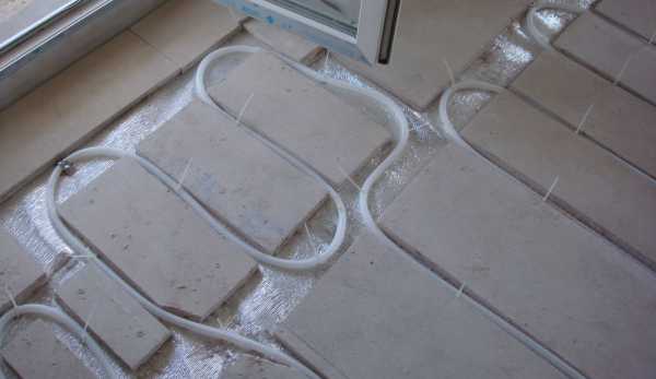 Необходимо в пазы настелить металлические теплоотражающие пластины, также можно использовать обычную фольгу. Наверх фольги укладываются трубки теплого пола, которые имеет диаметр в 16 миллиметров, для большей эффективности можно каждую трубку закрутить в фольгу. Чтобы трубки не выскакивали из пазов, необходимо в некоторых местах закрепить небольшие пластинки из металла.