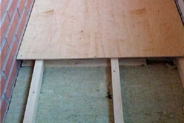 Первым делом необходимо провести разметку поверхности. Для этого чертят 3 продольные линии с отступом от стен 5 см и друг от друга на 40-60 см, в зависимости от ширины балкона. Затем по линиям устанавливают кронштейны через каждые 30-40 см. В установленные крепежные детали монтируют деревянные бруски и закрепляют их саморезами. После этого проводят монтаж поперечных лаг (обычно требуется не более 4 штук, удаленных друг от друга на равном расстоянии). Установленные лаги проверяют уровнем, после чего укладывают между ними минеральную вату или пеноплекс. Сверху конструкция накрывается фанерой, которую устанавливают на саморезы с шагом в 15 см.