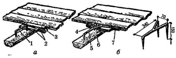 Сплачивание досок при настилке пола, а - обычными скобами; б - скобами Смолякова; 1, 5 - скобы; 2 - клинья; 3 - кусок доски; 4, 7 - клинья; 6 - лага).