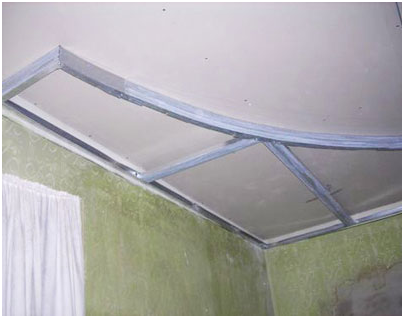 Для контуров будущего потолка применяются направляющие профили. Если требуется выполнить линию плавной, создать изгиб или полукруг, профиль немного надрезают и загибают в нужном направлении.