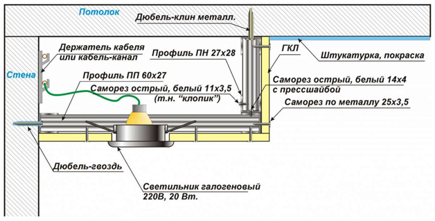Для крепежа двухуровневого потолка из гипсокартона используется специальный металлический каркас. Для небольших помещений применяют обычные каркасы. Как правило, к таким относятся кухня, маленькая прихожая или коридор. Но если поверхность комнаты позволяет выполнить сложные комбинации, понадобятся дополнительные крепежи.