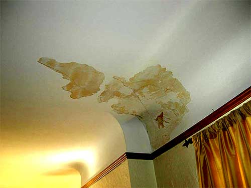 Протечка на натяжном потолкеПосле просто повреждения натяжной потолок можно отремонтировать: