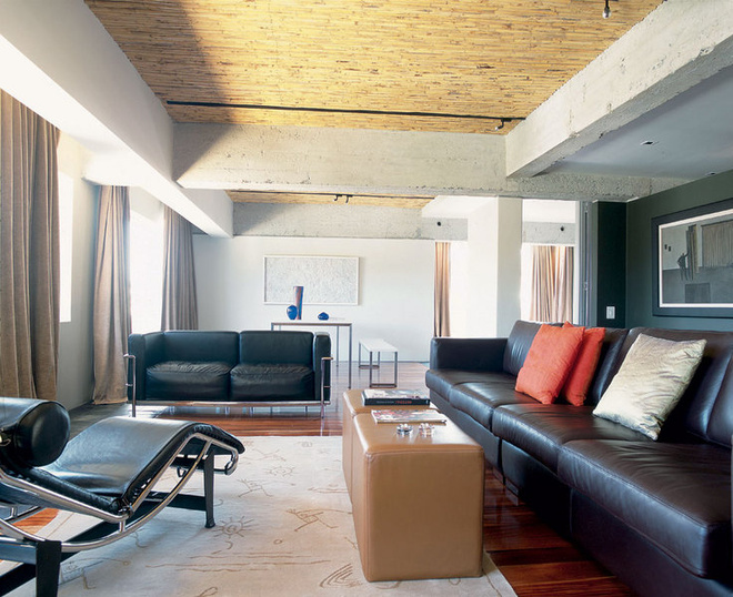 Циновки - непременный элемент восточного интерьера, но также хорошо они могут смотреться и в современном доме. «Плетеный» потолок смягчает строгость линий и привносит в продуманное и функциональное помещение элемент неожиданности.