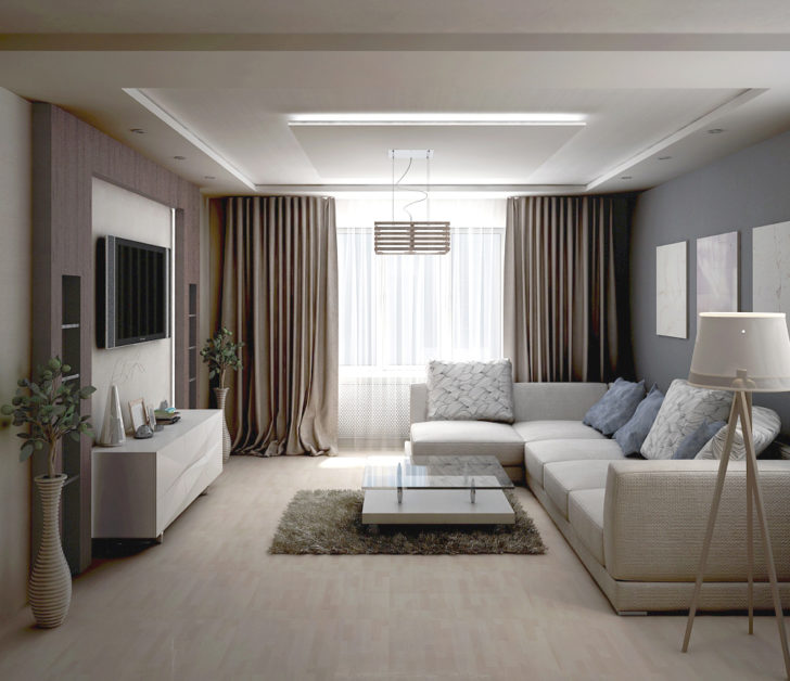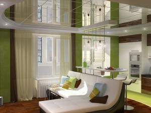 Визуальное увеличение пространства Обладая типовой квартирой, где пространства над головой определенно не хватает, где потолки буквально садятся вам на голову, совсем не лишним будет прибегнуть к некоторым визуальным ухищрениям, которые станут ответом на вопрос — как визуально увеличить высоту потолка. Грамотно выполненный дизайн с применением некоторых оптических иллюзий в этом вопросе лучший помощник: он поможет не только скрыть данный недостаток, но и качественно его обыграть: зрительно увеличить высоту потолков (см. Дизайн натяжных потолков в гостиной: современные тенденции). Наиболее эффективными являются: Увеличение высоты потолка при помощи обоев Простейшим решением насущной проблемы являются вертикальные полосы на обоях. Чувство меры здесь будет более чем уместно, ибо обои ярких расцветок, с широким рисунком комнату не спасут, скорее, добавят ей «приземистости». Напротив, использование неярких и неброских рисунков обоев покажет положительный результат — такие обои помогут визуально увеличить потолок. Желая добавить в дизайн ярких полос, разумно включать их акцентами, например, выделяя какую-либо зону (см. Натяжные потолки с рисунком — виды и советы по установке от настоящих профессионалов). Оклейка обоями впритык Ещё одним эффективным способом как увеличить высоту потолка зрительно, станет клейка обоев, и покраска стен впритык к потолку. В этом случае нужно избегать широких бордюров и плинтусов, окрашенных в цвет потолка, так как они крадут так необходимую нам высоту комнаты. В крайнем случае, плинтус следует окрасить в цвет стен и использовать достаточно тонкие детали (см. Поклейка обоев на потолок: порядок работы и полезные советы). Для зрительного увеличения высоты потолка, так же можно придать некоторую высоту стенам. Для этого нужно окрасить прилежащие края потолка, соприкасающиеся со стенами по всему периметру, или наклеить обои так, чтобы они заходили на поверхность потолка. Чем больше размер помещения, тем в большей степени мы можем задействовать крайние линии потолка. Совет: увлекаться, смазыванием границ между стеной и потолком, особенно не стоит, и съедать больше 30 сантиметров у потолочной плоскости крайне не рекомендуется. В комнате средних размеров достаточно и 5-ти сантиметров. В комнатах менее 12 квадратных метров данную технику лучше вообще не использовать. Светлые тона в интерьере Визуально увеличить расстояние между полом и потолком поможет использование в интерьере только светлых тонов и холодных оттенков.В такой игре с цветом рекомендуется одинаковый цвет потолка и стен, но в помещениях с низким потолком можно использовать цвет светлее на несколько тонов (см. Серый натяжной потолок: выбираем цветовые решения для спальни и коридора). Зеркальный пол В решении вопроса как увеличить высоту потолка зрительно, вовсе не обязательно объектом деятельности должна являться поверхность потолка, можно, например, акцентировать всё внимание на пол. Сделав плоскость пола блестящей или глянцевой с помощью лаков, можно добиться эффекта глубины, что как нельзя, кстати, придаст необходимого объема по всему помещению. Таким образом, можно задействовать любые материалы, так или иначе обладающие отражающими свойствами, будь то глянцевая плитка или поверхность, налитая по технологии зеркального пола