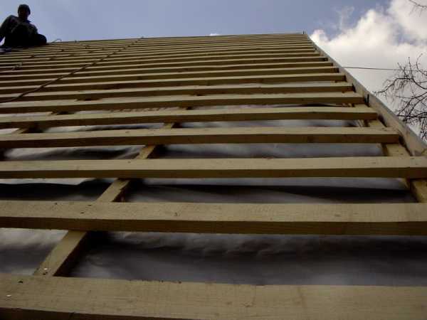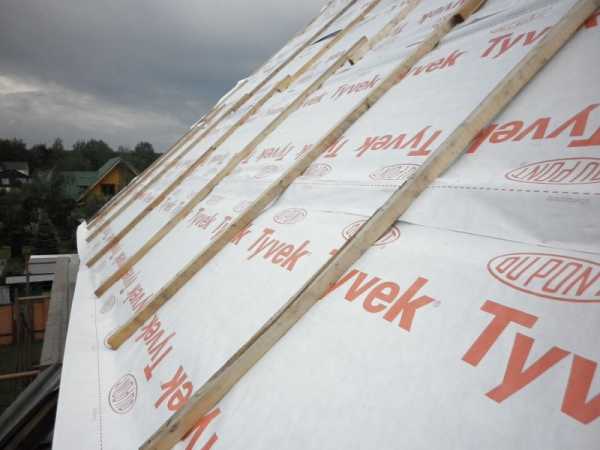 Первым слоем на стропила укладывается специальный пароизоляционный материал, который достаточно тонкий и его крепление производится при помощи степлера. Образовавшиеся швы нужно проклеить строительным скотчем.