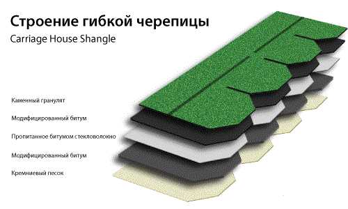 Гибкая черепица представляет собой небольшие плоские листы различной формы –многоугольники, лепестки, с закругленными или скошенными краями и другие. Изготавливается этот материал из нескольких слоев, основой является стеклоткань или стеклохолст, который с обеих сторон пропитывается модифицированным битумом.
