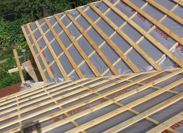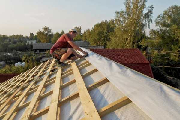 Далее идет укладка специальной гидроизоляционной мембраны, которая служит надежной защитой кровли от конденсата. Раскатывать гидроизоляционный материал нужно горизонтально, начиная от карниза и двигаясь по направлению к коньку. Стыковать рулоны между собой нужно на стропилах внахлест.