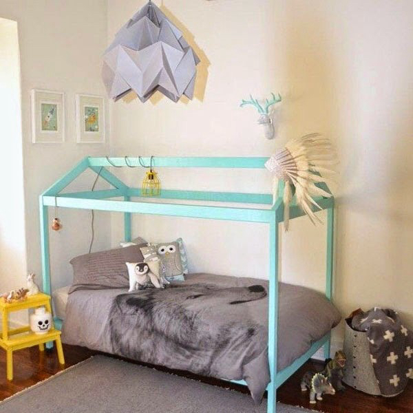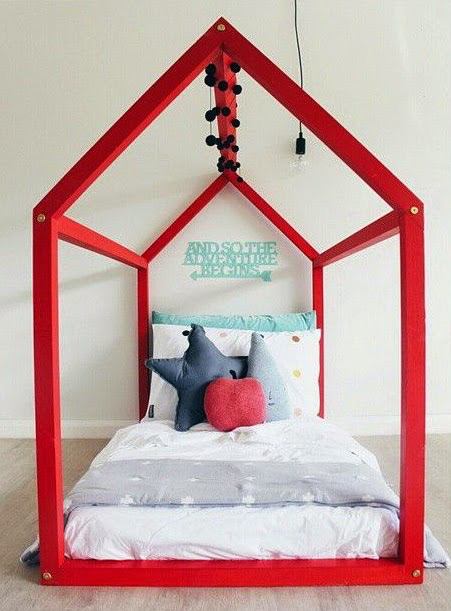 Для начала нужно выбрать форму будущего спального места. Для малышей подойдут невысокие одноярусные кровати. Если детей двое, то можно изготовить двухэтажную конструкцию с лестницей. Стены и крышу кровати-домика забивают досками или выполняют в форме каркаса. Второй вариант более прост в исполнении и подойдет для начинающих мастеров.