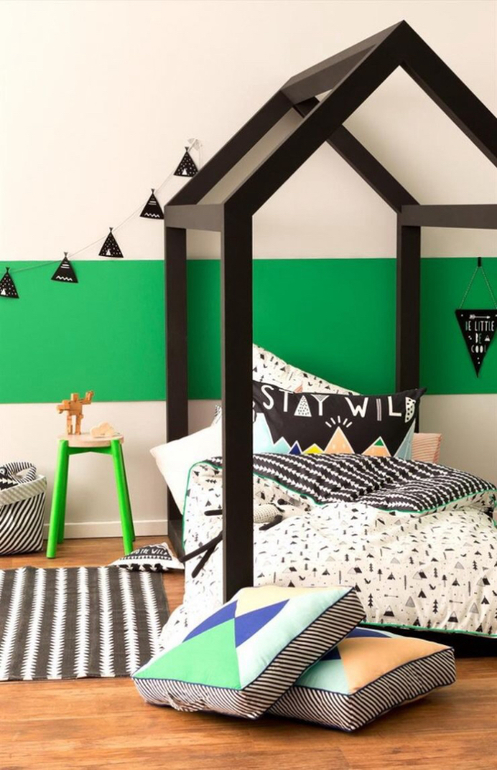 Декор кровати-домика будет зависеть от стиля интерьера и пола ребенка. Для девочки больше подойдут пастельные тона — мятный, бледно-голубой или традиционный розовый. Можно покрасить кровать и в яркие жизнерадостные цвета. Подобный вариант будет уместен как для девочек, так и для мальчиков.