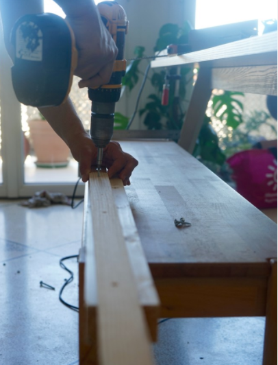 Рейки прикручиваются к плоским планкам, которые, в свою очередь, закрепляются к боковым каркасным сторонам. Важно провести правильное закручивание для скрытия саморезов. Межпланочный интервал получается в среднем 7 см, на дно уходит 13 деталей. Оставшиеся ламели подойдут для бортика безопасности, собранного при помощи угловых кронштейнов, но это необязательно.