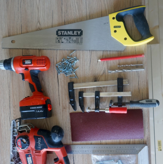 Начинаем собирать инструментальный стол. Из инструментов: торцовка, шлифмашинка эксцентрик, фрезер ручной, пила ручная, угольник, 4 струбцины небольшие, шуруповерт он же дрель.