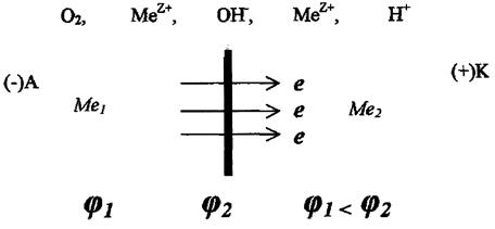 Таким образом, при электрохимической коррозии (как в случае контакта разнородных металлов, так и случае образования микрогальванических элементов на поверхности одного металла) поток электронов направлен от более активного металла к менее активному (проводнику), и более активный металл корродирует. Скорость коррозии тем больше, чем дальше расположены друг от друга в ряду стандартных электродных потенциалов те металлы, из которых образовался гальванический элемент (гальваническая пара).