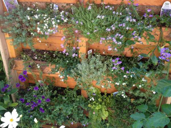 Также можно не обустраивать полок, а прикрепить ящики непосредственно к опоре. Для этого лучше всего подойдут контейнеры, задняя сторона которых образует прямой угол с основанием, что позволит надежно закрепить их на решетке. Можно взять старый поддон, затянуть его с внутренней стороны полиэтиленом, закрепить, установить и сделать прорези для цветов.