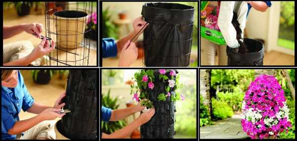 Подобная конструкция, но с несколько иной основой и наклоненными в разные стороны горшками. Красивые вертикальные цветники получаются из обычного шланга. Для их создания нужно установить столб или любую другую опору произвольной формы (можно использовать обрезанный не до конца ствол засохшего дерева). Взять шланг крупного диаметра, пропустить внутрь тонкую трубку с отверстиями для полива. Затем шланг заполнить грунтом и обвить его вокруг опоры или основы. В его верхней части сделать отверстия, куда и высадить растения.