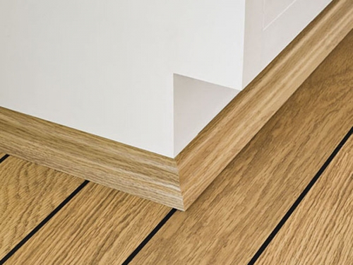 Второй вариант, плинтус шпонированный, обычно делается из елового или соснового массива, а затем покрывается сверху шпоном более ценных и дорогих пород дерева. Поэтому он выглядит не менее благородно, чем массивные изделия. Отличия между этими двумя видами плинтусов заключаются исключительно в цене: массивный деревянный плинтус из дуба обойдется вам дороже шпонированного. Что касается цветовой гаммы, то тут вам предоставлено огромное разнообразие оттенков. И можно выбрать именно тот, который гармонирует с самим напольным покрытием.