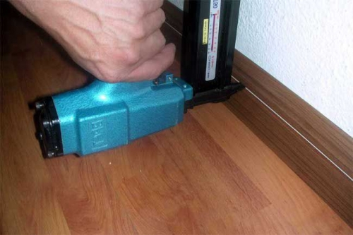 Процедура установки деревянных плинтусов на финишные гвозди похожа на предыдущую, однако вместо саморезов применяются финишные гвозди, а вместо дюбелей из пластика – деревянные. К достоинствам этого крепления можно отнести почти невидимое место крепежа. Однако вам следует принять во внимание, что в некоторых случаях деревянные дюбеля не удерживаются на поверхности: при сильных неровностях стен, если стены гипсокартонные или очень рыхлые.