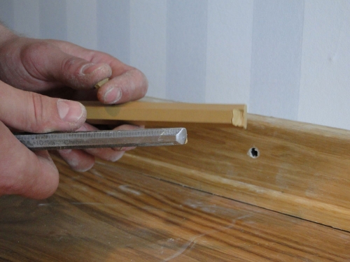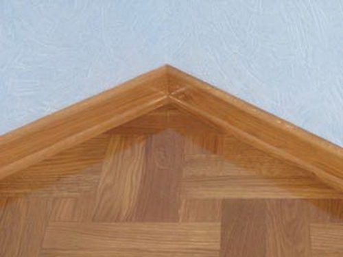 Так как в наших квартирах углы достаточно редко являются идеальными и имеют 90 градусов, после обрезки изделия на стусле рекомендуется вручную подгонять широкий деревянный плинтус под особенности конкретной комнаты. Доработку производят с помощью стусла и ножовки, или путем использования бруска и крупной наждачной бумаги. Идеальной состыковки не получится добиться все равно, поэтому стоит использовать цветные шпатлевки и герметики в тон древесины.