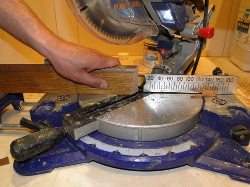 Затем специальными зажимами к корпусу стусла прижимается деревянный плинтус из бука. Он должен быть очень прочно прижат к корпусу, чтобы при резке не сдвинулся, ведь в этом случае отрез получится неправильным, а при стыковке плинтусов возникнет щель снизу или сверху. При креплении плинтуса также необходимо следить, чтобы задняя плоскость изделия плотно примыкала к станине, и между корпусом и задней плоскостью не было углов.