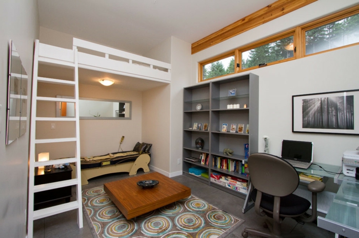 Чердак можно сделать в виде дополнительного спального места. И это будет уже двухъярусная кровать. Лестница на второй этаж должна быть прочной и комфортной, потому как именно по ней будет подниматься и спускаться ребенок несколько раз за день.