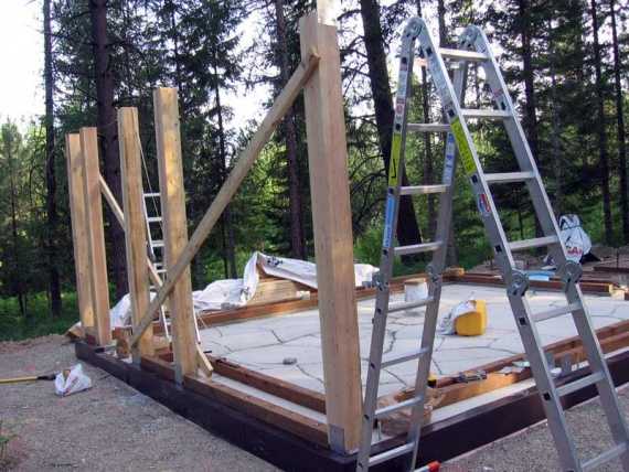 На шпильки приваривются или привинчиваются U образные стальные опоры под брус стоек. Столбы будущего дома из соломы выставлются с помощью уровня или отвеса по вертикали и прихватываются раскосами.