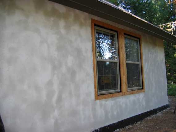 Штукатурят соломенные стены в два слоя, причем если плотность блоков более 200 кг/м3, то к работам можно приступать немедленно после строительства, если менее – необходимо дать соломе время отстоятся и уплотниться.