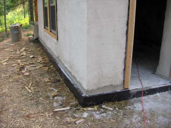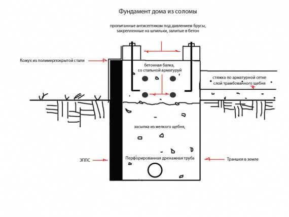 Дом из соломенных блоков имеет невысокую массу и нетребователен к фундаменту. Допустимо использовать небольшой поверхностный ленточный фундамент лежащий на дренированной подушке из гравия. Снаружи фундамент защищается ЭППС от промерзания. Этот способ неприменим на трофе — придется строить свайно-ростверковый фундамент.