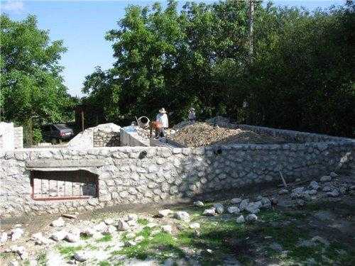 Под дом нужно построить фундамент. Поскольку дом очень легкий можно сооружать столбчатый, но в нашем случаи будет построен еще цокольный этаж, поэтому строился обычный ленточный фундамент. А стены цокольного этажа будут из камня. Вот здесь, на стадии сооружения фундамента, нужно помнить, что такой дом боится влаги и цоколь нужно строить высотой не менее 45 см.