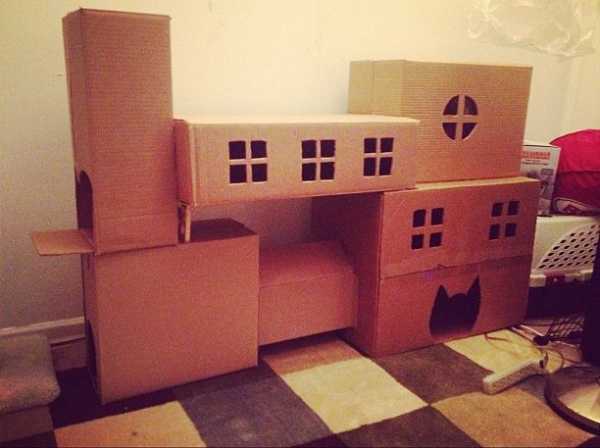 Из картона можно сделать действительно шикарные апартаменты для кошки, допустим в виде замка или смотровой башни, только вот прослужат они не очень долго, кот его рано или поздно начнет грызть и царапать когтями.