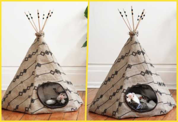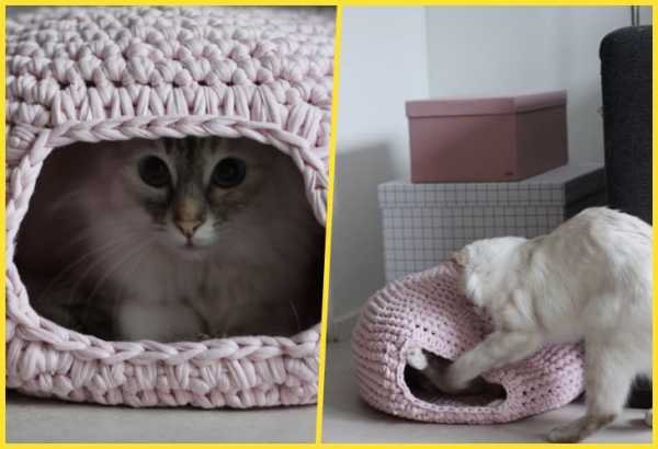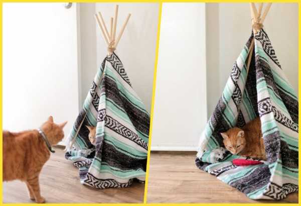 Второй вариант домиков для кошек - из ткани. Вы можете сделать шалаш, связать убежище или сделать домик из футболки и вешалок.
