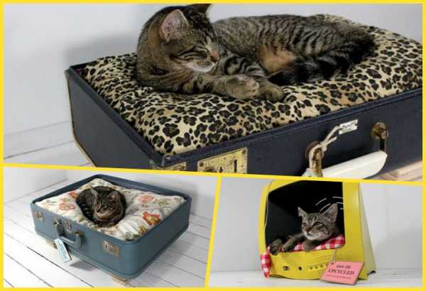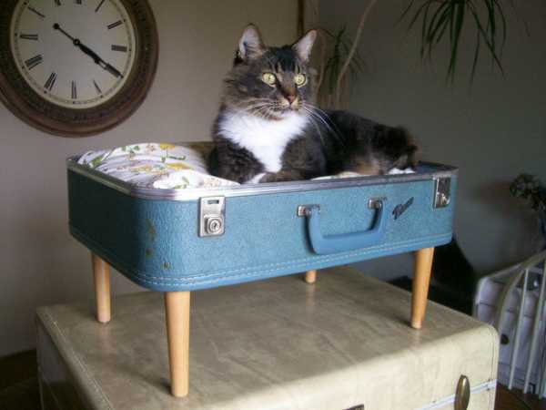 На заметку: домик-лежак можно смастерить из старого чемодана, к нему снизу нужно привинтить ножки и уложить мягкий коврик внутрь. Поверьте, кошка будет счастлива получить такой шикарный подарок.
