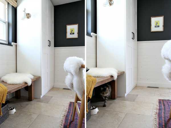 Для этого нужно всего лишь проделать в боковой стене тумбочки или шкафа лаз и соорудить мягкую лежанку из небольшого детского матрасика или старого одеяла. Если кошка любит подремать на возвышении, обустройте ей местечко на одной из книжных полок. Чтобы ей было удобно туда взбираться, поставьте рядом небольшую лесенку, обтянутую пеньковым или джутовым шпагатом.