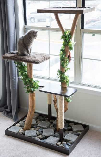 Кошке очень нравится лазать по веткам деревьев. Не откажите ей в этом удовольствии соорудите для нее приспособление из любых подручных средств – труб ПВХ или деревянных брусков, обшитых джутовой веревкой или обклеенных ковролином. Можно даже принести из леса и часть настоящего дерева с крупными сучками.