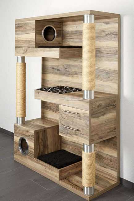 Принцип сборки конструкции схож с вышеописанным. Ее можно соорудить из фанеры, листов ДВП, ДСП или деревянных досок. Но вот щиты от старой полированной мебели для сборки использовать не стоит – животному вряд ли понравится переходить с полки на полку по скользкой поверхности.