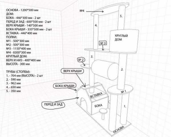 вернуться к меню ↑Сначала определитесь с местом постройки. Затем нужно измерить отведенный “угол” по высоте и ширине. Теперь подготовьте материалы, самые удобные для точения когтей животного. Это: