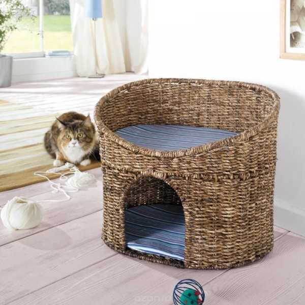 Еще один интересный сегмент ассортимента домиков – плетеные конструкции. В зависимости от навыков умельца, модель имеет форму традиционной корзины или выполняется двухъярусный экземпляр, где уютный домик для кошки дополнен вверху местом для созерцания окрестностей. Образец описанной плетеной конструкции представлен на фото далее: