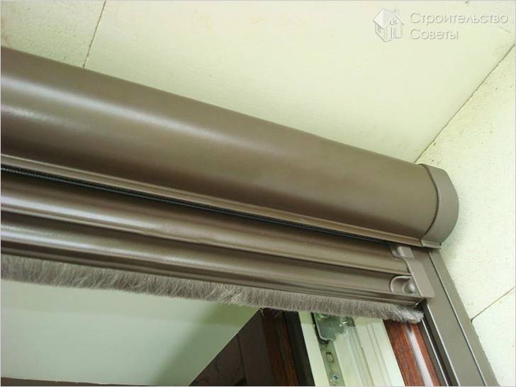 Конструкция москитной двери рулонного типа такова, что сетка является частью механизма. Такие двери могут быть как горизонтальными, так и вертикальными.