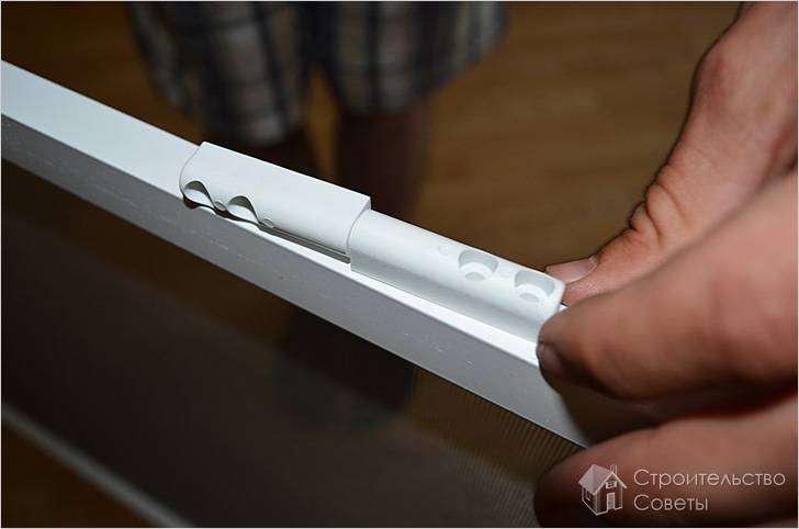 Верхний направляющий профиль закрепляется к раме балконной двери и несет основную нагрузку. В него защелкивается полотно магнитной москитной сетки, состоящее из двух частей. Каждая из них фиксируется слева и справа специальным профилем, снизу никаких креплений не требуется.
