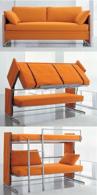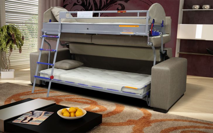 Современные модели, в которых обычный диван превращается в два высоких яруса с двумя спальными местами. Такую мебель-трансформер можно найти у некоторых производителей. Данный необычный вариант мебели по достоинству оценят подростки, используя днем диван, на ночью – спальные места.