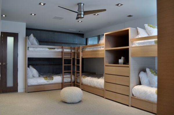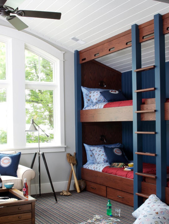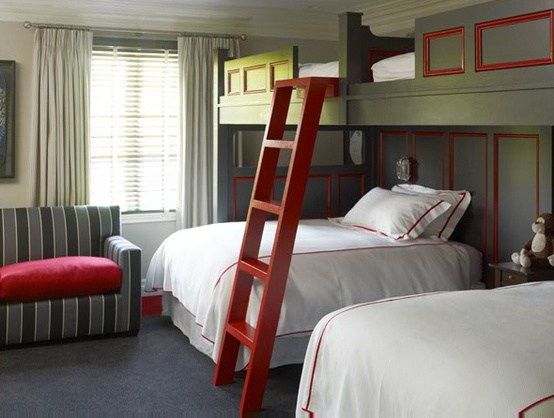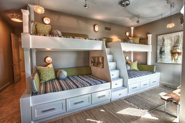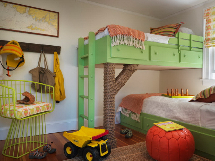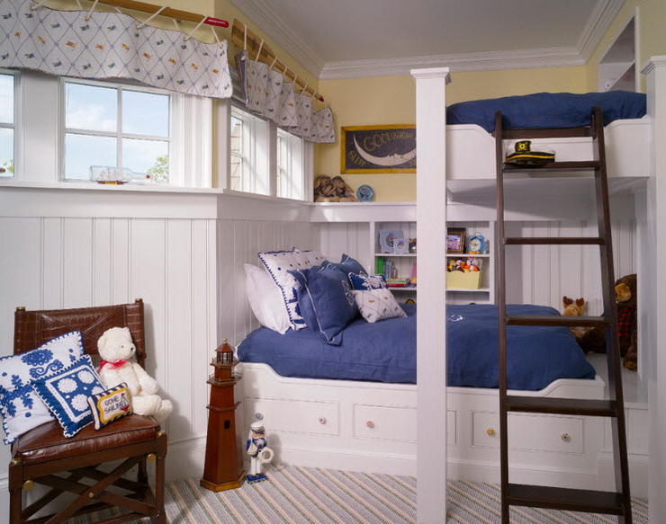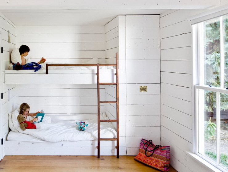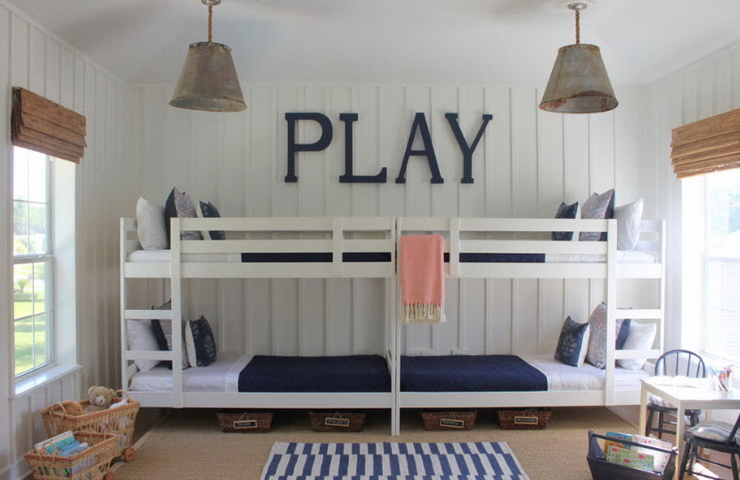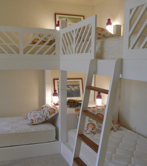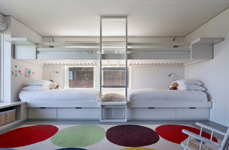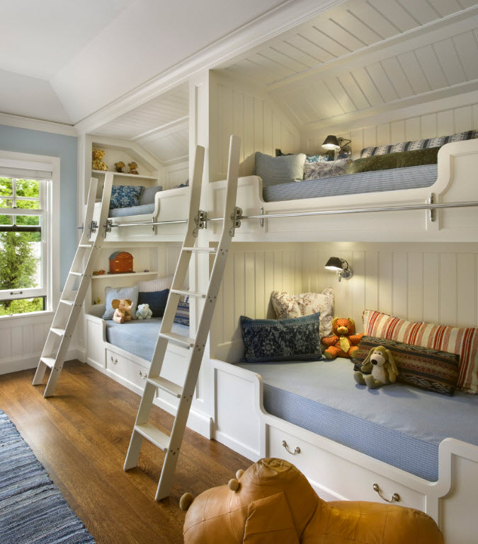 Восхитительный непринуждённый дизайн детской комнаты со спаренными многоуровневыми кроватями (проект Amy Maguire)