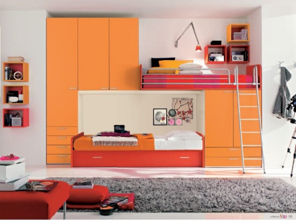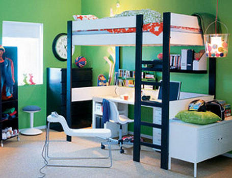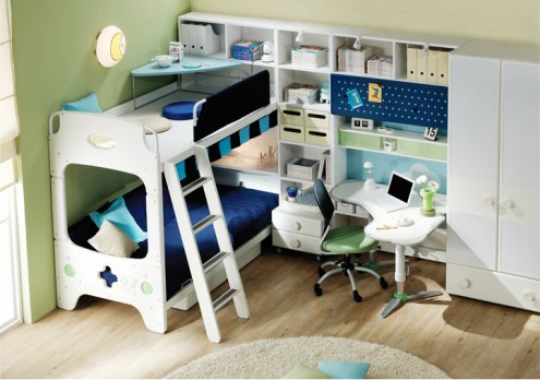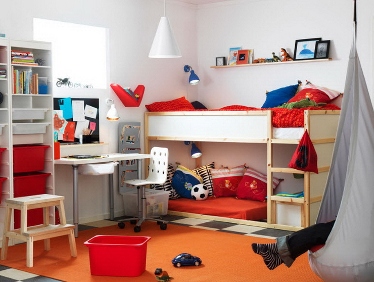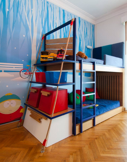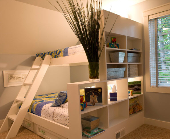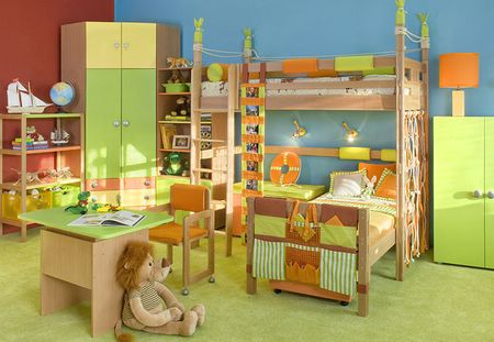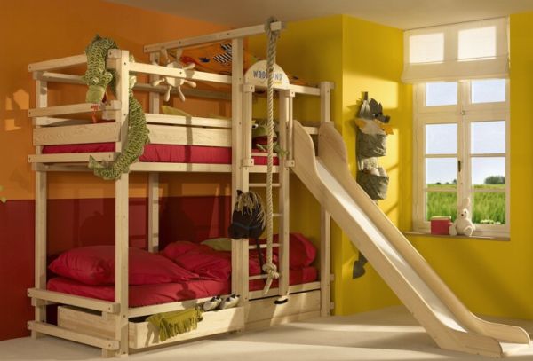 Но нужно сказать, что существенную помощь в решении этой проблемы оказывают дизайнеры, предлагающие кровати, в которых предусмотрены не только системы хранения, но и игровые элементы в виде традиционных лестниц, комплекса канатов и даже горок для весёлого спуска с верхнего яруса, а также физического развития растущего организма.