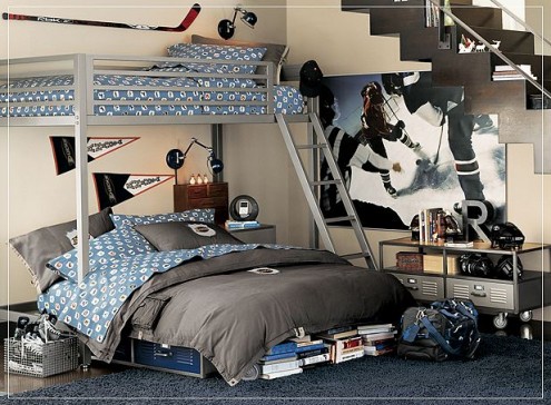Для мальчишек предпочтительна двухъярусная кровать в спортивной тематике, с воплощением идей из мультфильмов, кино в более строгом, простом варианте по сравнению с кроватями девочек.